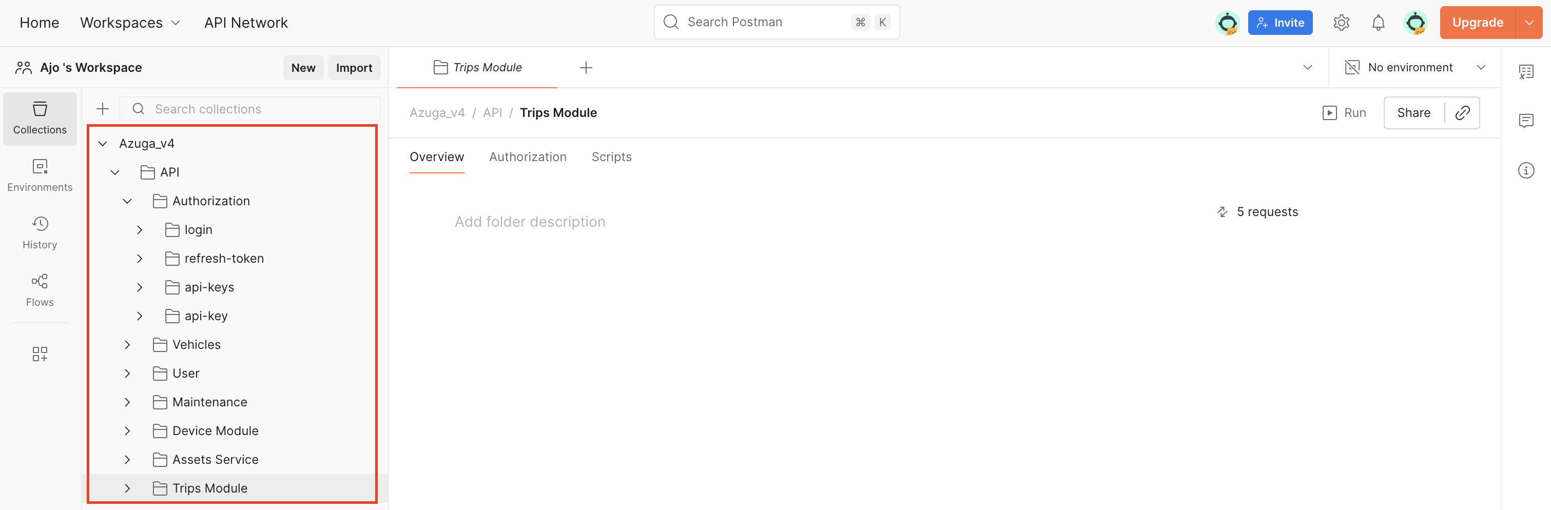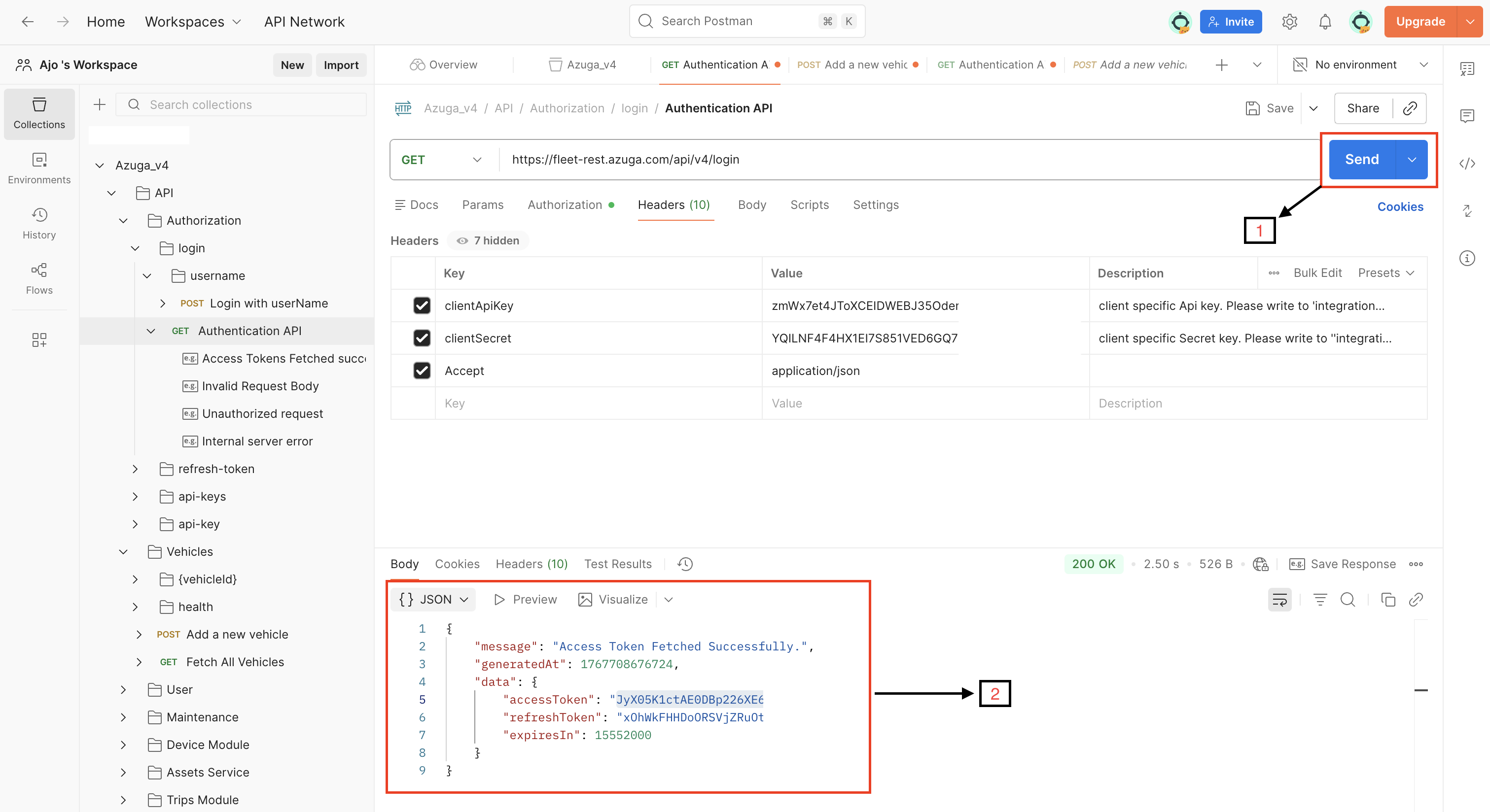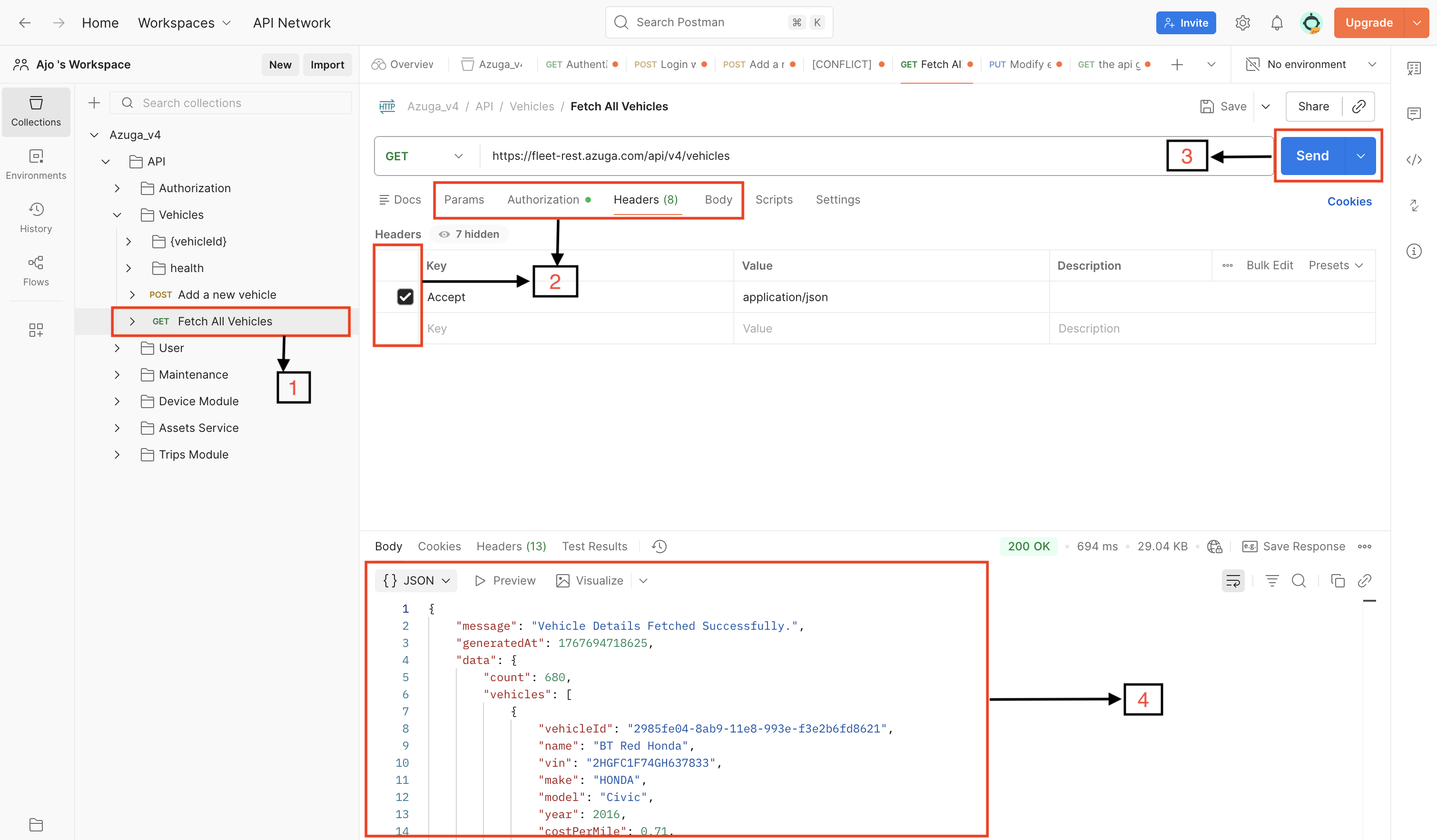 - From the Azuga_V4 Postman Collection on the left, expand the relevant module(eg. Vehicles) and select the API endpoint you want to test.