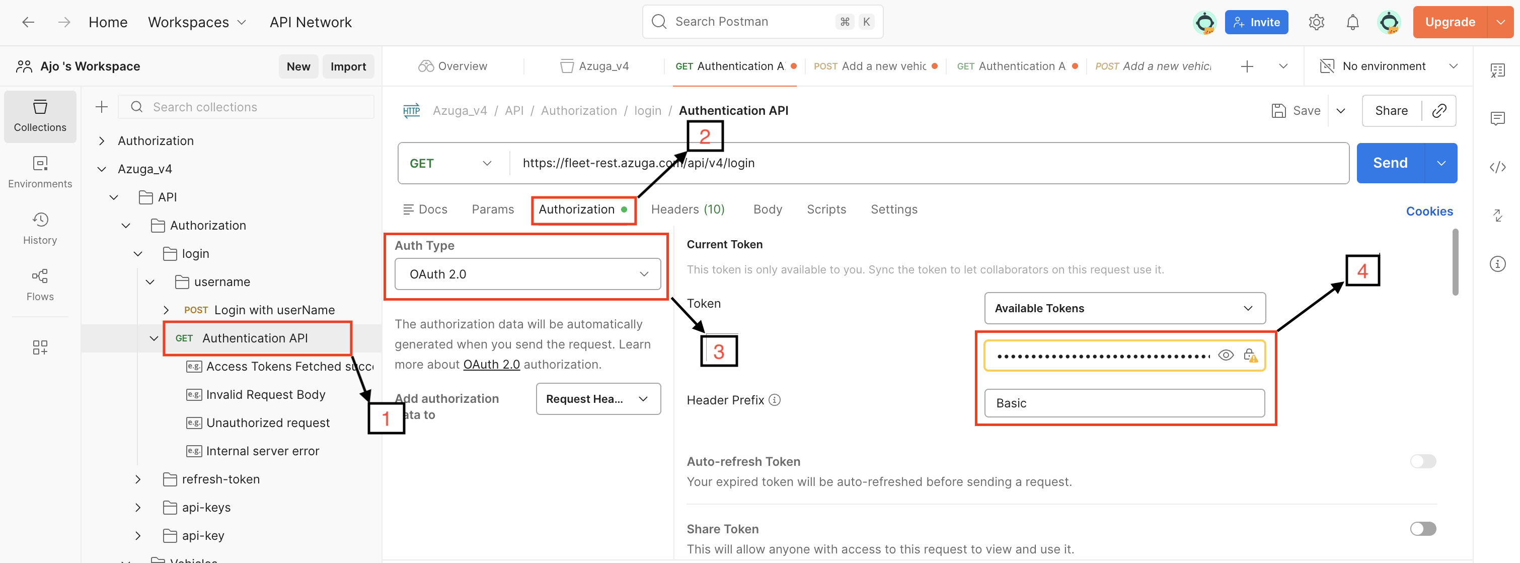 Azuga V4 APIs use OAuth 2.0 based authentication, which is already preconfigured in the Postman collection.